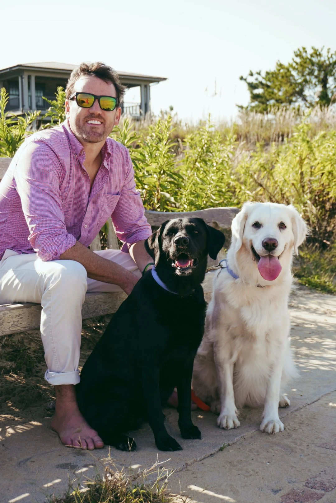 A man in a pink checkered shirt and white pants sitting on a bench outdoors with two dogs, one black Labrador and one yellow Labrador, in a sunny setting with greenery and a house in the background.
