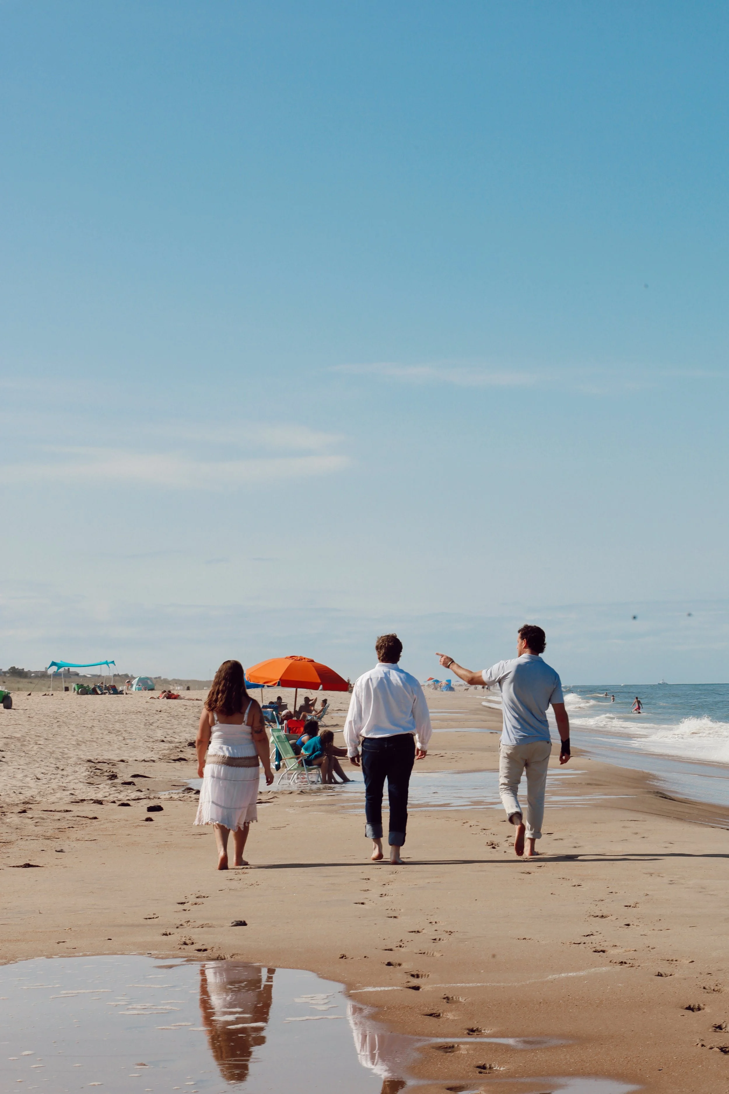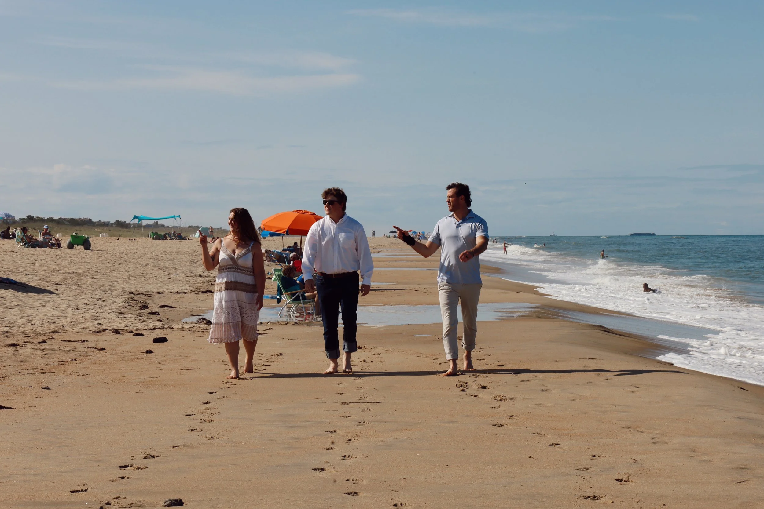 Three people walking along a sandy beach, two men and a woman, engaged in conversation. The woman is wearing a dress, and one man is dressed in white with rolled-up jeans, the other in a light shirt and pants. In the background, there are beach umbrellas, people relaxing, and others in the water. The sky is mostly clear with some clouds.